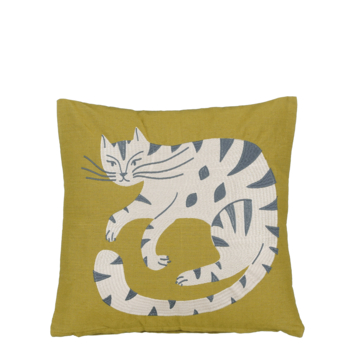 Dit vierkante sierkussen is echt een eyecatcher! Door de oker kleur valt hij namelijk gelijk op. Op het kussen staat een kat in een beige kleur met grijze strepen. Het kussen is handgemaakt van katoen en heeft een brandvertragende vulling - erg fijn. Door de stof is hij heerlijk zacht om tegenaan te zitten tijdens het kijken van je favoriete serie. Dus niet alleen leuk voor het oog, maar ook nog eens erg comfortabel. Daar komt bij dat je door de ritssluiting de kussenhoes regelmatig kunt reinigen. De afmetingen zijn L45 x B45 x H10 cm.