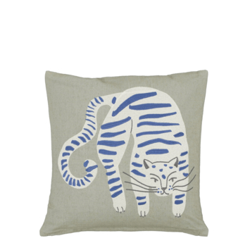 Op zoek naar een comfortabel, maar opvallend item? Dan is dit sierkussen wat je zoekt! Op het vierkante, lichtgroene kussen staat een witte kat met blauwe strepen. Hij is handgemaakt van katoen waardoor hij erg lekker is om tegenaan te zitten. Perfect als steun in je rug tijdens het kijken van je favoriete serie! Verder is de vulling van brandvertragend materiaal en heeft dit sierkussen een ritssluiting, erg fijn. Plaats hem als decoratie op de bank, de fauteuil of op het bed: alles is mogelijk! De afmetingen zijn L45 x B45 x H10 cm.