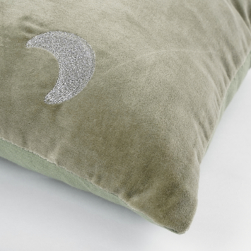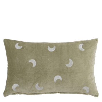Als je op dit sierkussen ligt vertoef je letterlijk met je hoofd tussen halve maantjes. Het heeft een fraaie print van halve maantjes en is gemaakt van katoen, waardoor het heerlijk zacht aanvoelt. Maar het staat ook gewoon mooi als decoratiestuk en zorgt voor extra fleurigheid. Het sierkussen heeft een frisse groene kleur en heeft als afmeting L55 x B35 x H14 cm.