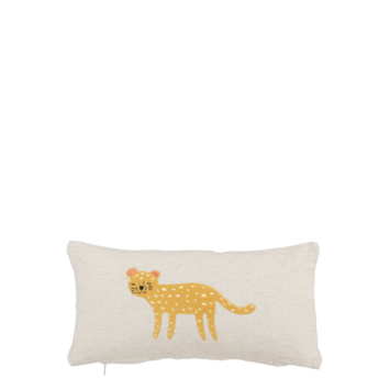 Heeft de slaapkamer van je kleintje een safarithema? Daar hoort dit sierkussen dan ook bij. Het heeft een okergele kleur en is voorzien van een pantermotief. Doordat het is vervaardigd van katoen voelt het heerlijk zacht aan. Naast een mooi decoratiestuk, is het sierkussen dus ook heerlijk voor je kleintje om mee te knuffelen. Het heeft als afmeting L40 x B20 x H10 cm.