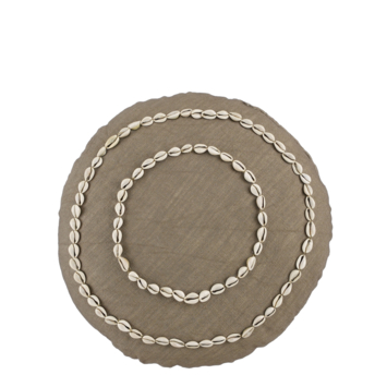 Dit sierkussen voegt een zomerse touch toe aan je interieur. Met zijn ronde vorm en bruine kleur straalt dit kussen elegantie uit, terwijl twee cirkels van subtiel geplaatste schelpen een verfrissende beachy en bohemian sfeer toevoegen. Het is handgemaakt van hoogwaardig katoen, wat zorgt voor zachtheid. Plaats dit sierkussen als decoratie op de bank of op het bed en geniet van dit esthetische item. Ook leuk voor in een vakantiehuisje aan het strand! Verder voegt dit kussen niet alleen flair toe, maar heeft het ook nog eens een extra veiligheidskenmerk door de brandvertragende vulling. De afmetingen zijn H10 xø45 cm.