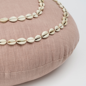 Dit sierkussen voegt een zomerse touch toe aan je interieur. Met zijn ronde vorm en lichtroze kleur straalt dit kussen elegantie uit, terwijl twee cirkels van subtiel geplaatste schelpen een verfrissende beachy en bohemian sfeer toevoegen. Het is handgemaakt van hoogwaardig katoen, wat zorgt voor zachtheid. Plaats dit sierkussen als decoratie op de bank of op het bed en geniet van dit esthetische item. Ook leuk voor in een vakantiehuisje aan het strand! Verder voegt dit kussen niet alleen flair toe, maar heeft het ook nog eens een extra veiligheidskenmerk door de brandvertragende vulling. De afmetingen zijn H10 xø45 cm.