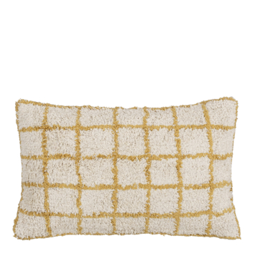Geef je interieur een boost met dit sierkussen! Het tijdloze kussen heeft de vorm van een rechthoek en is wit met een oker blokpatroon. Door het ontwerp past het in elke woonstijl: van landelijk tot modern. Hij is handgemaakt van katoen. Hierdoor ziet hij er niet alleen leuk uit, maar is hij ook nog eens heerlijk om tegenaan te zitten. Hij zit extra lekker door de zachte afwerking, erg fijn! Verder heeft het kussen een ritssluiting waardoor je de kussenhoes kunt reinigen en is hij gevuld met een brandvertragende vulling. De afmetingen zijn L55 x B35 x H10 cm.