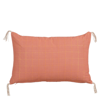 Dit rechthoekige sierkussen met ruitjes en schattige kwastjes op de hoekjes voegt een speelse en stijlvolle touch toe aan je interieur. De klassieke ruitjes en de verfijnde kwastjes maken het een elegant accent voor elke bank of stoel. Perfect voor een gezellig en trendy uiterlijk! De kleur is roze en de afmetingen zijn L55 x B35 x H10 cm.