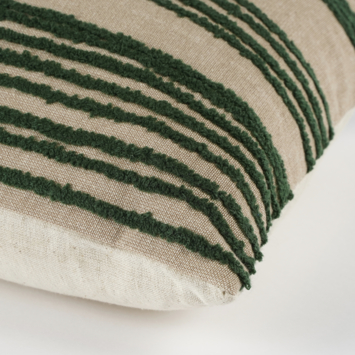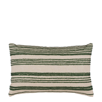 Dit gestreepte sierkussen zorgt ervoor dat elke ruimte opleukt! De basiskleur van het kussen is beige en de horizontale strepen zijn groen. Hij is gemaakt van katoen en met de hand gevuld met brandvertragende vulling: dat zit toch net iets lekkerder! Verder heeft het een ritssluiting waardoor je de kussenhoes er eenvoudig af kunt halen, ideaal! Plaats hem op de bank, de fauteuil of op het bed. De afmetingen zijn L55 x B35 x H10 cm.