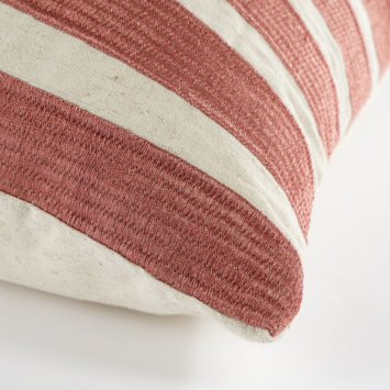 Dit sierkussen voegt een elegante touch toe aan je interieur. Het vierkante kussen is wit met een verticaal gestreept motief in de stof in een donkerroze kleur, waardoor het verfijning en stijl uitstraalt. Het is handgemaakt van katoen: heerlijk zacht en comfortabel om tegenaan te zitten tijdens het lezen of tv-kijken. Verder is de kussenhoes afneembaar door de ritssluiting en heeft het kussen een extra veiligheidskenmerk door de brandvertragende vulling. Plaats het kussen als decoratie op de bank of op het bed en geniet van dit esthetische item. De afmetingen zijn L45 x B45 x H10 cm.