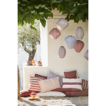 Fan van gestreepte items? Dan is dit paarse sierkussen perfect! Het kussen bestaat gedeeltelijk uit dunne lijnen en gedeeltelijk uit dikke lijnen. Hierdoor krijgt hij een leuk effect en fleur je direct je interieur op. Het kussen is gemaakt van katoen en hij is met de hand gevuld met brandvertragende vulling. Verder heeft het kussen een ritssluiting waardoor je de kussenhoes er makkelijk af kunt halen om deze te reinigen. Het vrolijke sierkussen heeft de vorm van een rechthoek en de afmetingen zijn L55 x B35 x H10 cm.