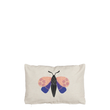 Geniet van natuurlijke schoonheid binnenshuis! Dit rechthoekige sierkussen is Crème en heeft een mooi borduurwerk van een vlinder in verschillende opvallende kleuren op de voorkant. In het borduursel zijn ook kralen verwerkt, erg mooi! Het kussen is van katoen en met de hand gevuld, waardoor je heerlijk comfortabel er tegenaan kan leunen. Verder is deze vulling van brandvertragend materiaal. Dan zit je toch nog iets lekkerder! Door de ritssluiting kun je de kussenhoes eenvoudig verwijderen. De afmetingen zijn L35 x B25 x H7 cm.