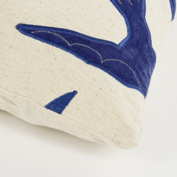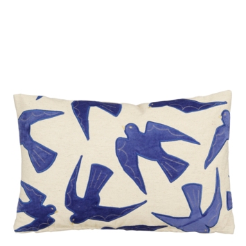 Wist je dat sierkussens je interieur een geheel nieuwe look kunnen geven? Zeker dit vrolijke sierkussen. Het rechthoekige kussen heeft een witte basiskleur met daarop een vogelprint in het blauw. Hij is gemaakt van katoen waardoor hij erg zacht is om tegenaan te zitten. Plaats hem als decoratie op de bank, de fauteuil of op bed! De afmetingen zijn L55 x B35 x H10 cm.