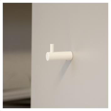 Witte designhaak, te gebruiken als jashaak in een garderobe of als handdoekhaak in keuken of badkamer.
