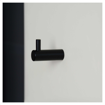 Zwarte designhaak, te gebruiken als jashaak in een garderobe of als handdoekhaak in keuken of badkamer.