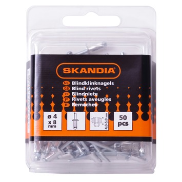 De Skandia blindklinknagels 4x8 mm, ook wel popnagels genoemd, zorgen dat twee stukken plaatmateriaal, als deze maar aan één kant toegankelijk is, aan elkaar worden verbonden. Een blindklinknagel bestaat uit een metalen huls met of zonder kop en een stalen trekpen met een bolle kop, welke met behulp van een blindklinktang in de huls wordt getrokken. De huls zet hierdoor uit en klemt zich vast in de twee stukken plaatmateriaal. Deze 8 millimeter lange aluminium blindklinknagels, diameter 4 millimeter, zijn te gebruiken in een boorgat met een diameter van 4,1 millimeter en een klinkdikte van 4 tot 5 millimeter. Verpakking: doosje 50 stuks.