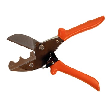 Vernikkeld met kunststofhandvatten met beschermnokken. Geschikt voor : Ronde PVC buis 5/8"( 16 mm ) en 3/4"( 19 mm ). Voor het braamvrij knippen. Met veer en handige vergrendeling.