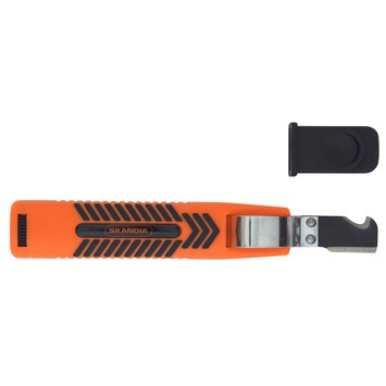 Het Skandia kabelafstripmes met haak-/stripmes is geschikt voor het strippen van alle gangbare ronde kabels met een diameter van 8 tot 28 millimeter. Met de stelgroef in het handvat kun je het mes instellen op de dikte van de buitenisolatie van de kabel. Door de ronde draaibeweging van het mes wordt de buitenisolatie doorgesneden en kan dan in de lengte worden afgestript.