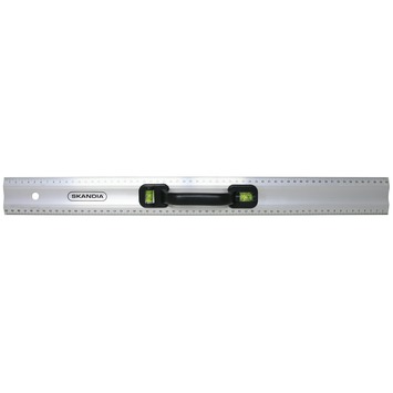 De Skandia liniaal 600 mm met waterpaslibellen is handig bij het op de juiste hoogte en waterpas ophangen van onder andere keukenkastjes en schilderijen. De 600 millimeter lange aluminium liniaal is voorzien van twee libellen (horizontaal en verticaal) en een kunststof handvat. De maatverdeling in millimeter en centimeters wordt op beide zijden van het blad duidelijk aangegeven.