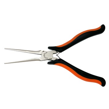 Met doorgestoken scharnier. Vervaardigd uit hoogwaardig gereedschapstaal. Roestwerend door een speciale chroom satijn coating. Comfortabele zwart/oranje kunststof 2 componenten antislip handgrepen. Met openings veer. Zeer slank model.