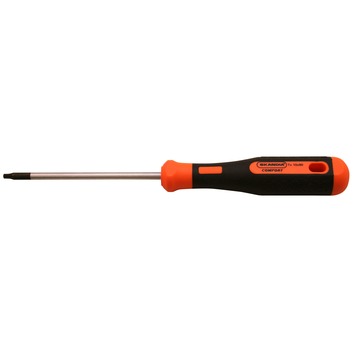Deze Skandia schroevendraaier torx TX10x85 mm is een sterke 185 millimeter lange schroevendraaier met een 85 millimeter lange stalen kling, voorzien van een extra nageharde zes hoekpunten in stervorm punt. De softgrip en antislip kunststof handgreep zorgt dat de Skandia schroevendraaier torx TX10 stevig en prettig in de hand ligt.