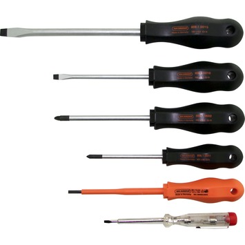 Deze Skandia 6-delige schroevendraaierset bestaat uit 6 schroevendraaiers met een twee componenten antislip handvat die ook nog eens is voorzien van een ophanggat. Zo berg je deze set dan ook erg gemakkelijk en overzichtelijk op. De Skandia schroevendraaierset bestaat uit één spanningzoeker, drie sleufschroevendraaiers (platte kop) en twee kruiskopschroevendraaiers. De schroevendraaiers zijn gemaakt van chroom vanadium staal dat extra gehard is. De set bestaat uit de sleufmaten 5,5 x 100 mm, 8 x 150 mm, VDE 3,5x100 mm en de kruiskopmaten PZ-1x80 mm, PZ-2x100 mm. Het mooie aan de Skandia 6-delige schroevendraaierset is dat deze is voorzien van een spanningzoeker en een geïsoleerde schroevendraaier zodat deze ook te gebruiken is voor bijvoorbeeld het veilig ophangen van een (plafond)lamp.
