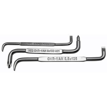Chroom vanadium staal. Glansvernikkeld. Inhoud: elk 1 haakse kruiskop PH 1 - PH 2, haakse gleuf schroevendraaier 100 x 5 mm, 125 x 6 mm.