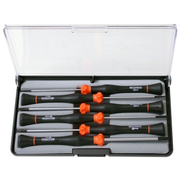 Chroom vanadium staal. Zwart kunststof hecht met draaibare top. Klingen extra nagehard met zwarte punt. Inhoud: elk 1 75 x 2,0, 2,4 x 3,0 , PH 0 x 1. In fraaie kunststof cassette.
