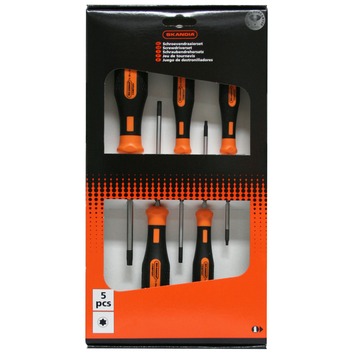 Volgens DIN 7984-7985. Chroom vanadium staal. Hoogwaardige kwaliteit. Klingen extra nagehard met zwarte punt. Zwart/oranje kunststof 2 componenten antislip handvat. Inhoud: 1 x TX 10-15-20-25-30.