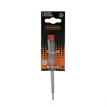 Deze Skandia spanningzoeker 60x3 mm, ook wel spanningtester genoemd, is een 140 millimeter lange enkelpolige spanningzoeker om eenvoudig en veilig te testen of er spanning op elektriciteitsdraden of stopcontacten staat. De spanningzoeker heeft een 60 millimeter lange geïsoleerde kling met een 3 millimeter dikke punt. De spanningzoeker is VDE-gekeurd voor 125 tot en met 250 volt.