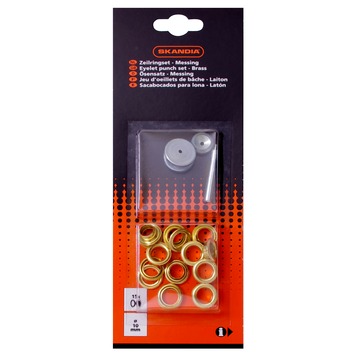 Messing zeilringen. Voor reparaties aan tenten, boten, zeilen, schoenen, enzovoorts. Bestaande uit: holpijpje, zeilkousstempel en zeilringen.