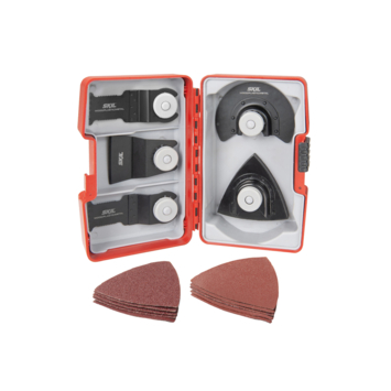 Deze set met 18 multitoolaccessoires bestaat uit een segmentzaagblad om dichtbij randen en in hoeken te zagen, twee invalzaagbladen om diep invallend te zagen in hout, kunststof of metaal, twee schrapers voor het verwijderen van materiaalresten en een schuurschijf met verschillende soorten schuurpapier.