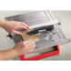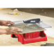 Voor extra stabiliteit zijn de rubberen voetjes voorzien, terwijl geïntegreerde verdeelschalen het meten vereenvoudigen. De verstelbare afkortgeleider met verstekgeleider maakt het mogelijk om tegels nauwkeurig recht of in verstek te zagen. De stofdichte aan-uitschakelaar en herstartbeveiliging zorgen voor veilig gebruik en voorkomen dat de machine automatisch opnieuw start na een stroomonderbreking.
