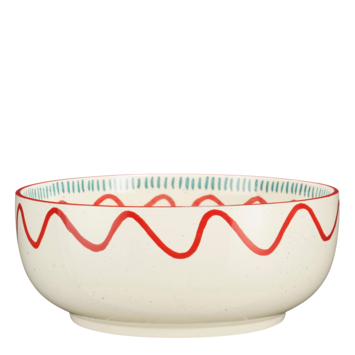 Geef je tafel een zomerse uitstraling met deze slabak. Deze kom van stevig steengoed heeft een frisse witte basis met een speels rood-blauw lijnmotief. Perfect om salades, fruit of andere lekkernijen stijlvol te presenteren tijdens zonnige dagen. Met een hoogte van 13,5 cm en een diameter van 34,5 cm is het een echte blikvanger op elke tafel. Een sfeervolle keuze voor elke zomer- of lentesetting!