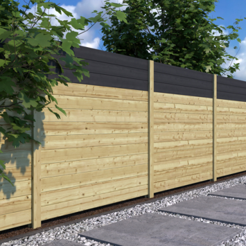 Plaats de eerste eindpaal voor 1/3 in de grond. Behandel het deel welke in de grond gaat eventueel met rubber seal. Plaats de volgende paal (eindpaal of tussenpaal) op 180 + 1 cm afstand en zorg dat deze in een rechte lijn staat. Controleer regelmatig met een waterpas of alle palen waterpas staan. Schuif hierna de eerste plank tussen de gleuven. Monteer de eerste plank altijd ca. 1 tot 2 cm boven de grond om grondcontact te vermijden. Hierna kunnen alle overige planken aan de bovenkant erin geschoven worden. Werk zo de gehele schutting af.