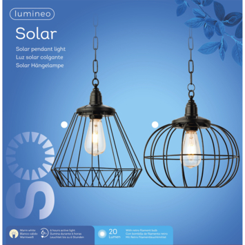 Hang deze leuke metalen buitenlamp in een boom of aan je balkon. Door het geintegreerde solar systeem kan de lamp voor 6 uur licht. De lamp is verkrijgbaar in zwart in 2 verschillende vormen. De solar hanglamp heeft een aanloopsnoer van 55cm waardoor je hem gemakkelijk op kunt hangen.