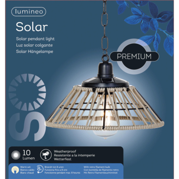 Hang deze leuke buitenlamp in een boom of boven je eettafel in de tuin. De hanglamp is gemaakt van metaal met rotan. Met het geintegreerde solar systeem kan de lamp voor 8 uur branden. Het aanloopsnoer van de lamp is 50cm waardoor je hem gemakkelijk op kunt hangen. De hanglamp is verkrijgbaar in rotan zwart en naturel.