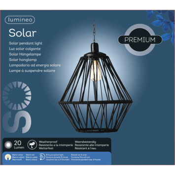 Hang deze leuke buitenlamp in een boom of aan je balkon. De hanglamp is gemaakt van metaal met touw. Door het geintegreerde solar systeem kan de lamp voor 8 uur licht. De hoogte van de lamp is 47cm van het aanloopsnoer van de lamp is 60cm waardoor je hem gemakkelijk op kunt hangen.