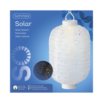 Deze lampion is een echte sfeermaker voor in je tuin. De op zonne-energie werkende lantaarn is gemaakt van kunststof waardoor hij geschikt is voor buiten. Leuk ter aankleding van een feestje. Bovenop de lampion zit een oplaadpaneel. Zorg er voor dat de lampion voldoende licht krijgt en de warm witte LED lamp in de lampion geeft een sfeervol licht. De lampion heeft een diameter van 20 cm en een hoogte van 30cm