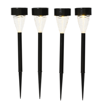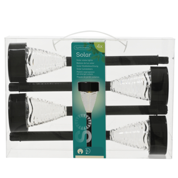 Als het buiten donker wordt, gaat in deze sfeerlampen het licht aan. Deze tuinstekers zijn ideaal om uw tuin, terras of tuinpad te verlichten. Met een gemiddeld aantal branduren van 6 uur heb je de hele avond plezier van deze sfeerlampjes. Deze set van 4 stuks heeft een geïntegreerde LED lichtbron en brandt op zonne-energie. Doordat ze snoerloos zijn, zijn ze op elke gewenste plek in je tuin te zetten.