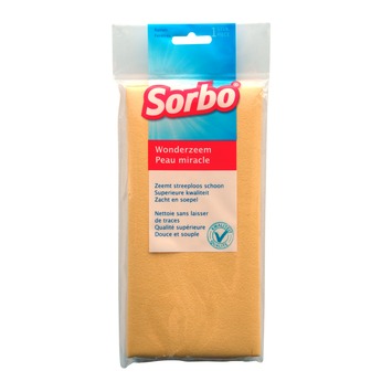 De Sorbo wonderzeem is de ideale hulp voor in huis of voor bijvoorbeeld in de auto. De gele wonderzeem is van superieure kwaliteit, zacht en soepel en zeemt streeploos schoon. De zeem is 38 bij 40 centimeter groot en is universeel in gebruik.