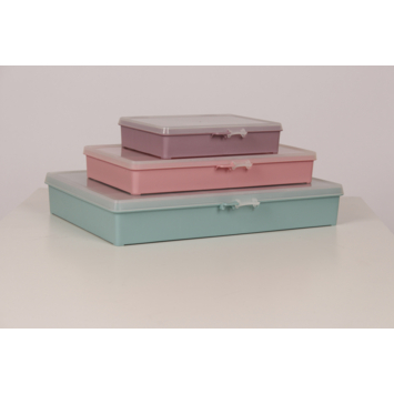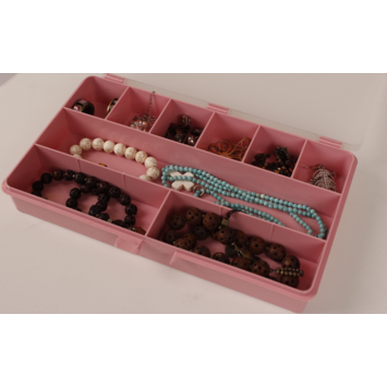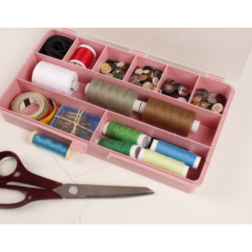 Ik heb deze gekocht voor het opbergen van borduurgarens. Die garens vind je niet bij Karwei maar dit gebruik is nou typisch een geval van out of the box denken. Dat overkwam me toen ik in de winkel was. Er zitten een paar kleine vakjes in en een paar grotere en de kartonnetjes met garen passen er goed in. Eigenlijk is het doosje iets te laag om de kartonnetjes rechtop te zetten maar met een beetje drukken kreeg ik het deksel weer dicht.