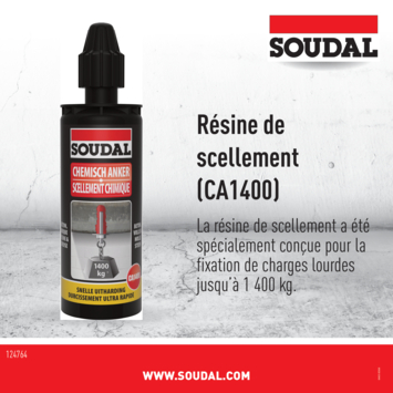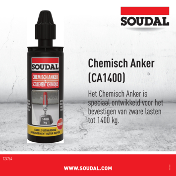 Soudal chemisch anker speciaal ontwikkeld voor het bevestigen van zware lasten tot wel 1.400kg. De super sterke lijm is ideaal om bijvoorbeeld een TV, trapleuning, mast, zonwering, rolluiken en hangstoelen mee op te hangen.