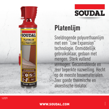De Soudal isolatielijm met Genius kop is speciaal ontwikkeld voor het verlijmen van PIR-platen. Dankzij de slimme doseerkop breng je de lijm precies aan waar dat nodig is, zonder verspilling. De formule is sneldrogend en heeft een lage uitzetting, waardoor je een strak en nauwkeurig resultaat krijgt. Dat maakt deze lijm geschikt voor zowel horizontale als verticale toepassingen, bijvoorbeeld bij het plaatsen van isolatiepanelen op muren of houten raamwerken.