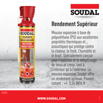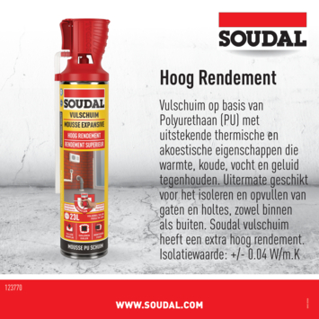 Snel en eenvoudig kieren, gaten, scheuren en voegen in diverse bouwmaterialen opvullen, kan met Soudal PU-schuim 600ml. Door de hoge isolatiewaarde is dit schuim ideaal voor het isoleren van daken, panelen en golfplaten. Ook maak je raam- en deurkozijnen eenvoudig wind- en tochtdicht. Dankzij het 'Genius Gun'-systeem heeft de bus een handig handvat waarmee je het PU-schuim eenvoudig kunt uitspuiten. Met het sluitsysteem is deze bus perfect af te sluiten, zodat je deze tot 6 weken na elk gebruik kunt gebruiken. Kortom: een PU-schuim met goede thermische en isolerende eigenschappen die je makkelijk aanbrengt.