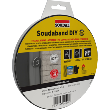 Met Soudal Soudaband DIY BG1 15/8-15 werk je voegen netjes en efficiënt af. De voorgecomprimeerde voegband met kleefzijde plaats je eenvoudig in de voeg, waarna hij vanzelf uitzet en de ruimte volledig opvult. Zo ontstaat een nette en functionele afdichting zonder dat je nog moet afwerken.
