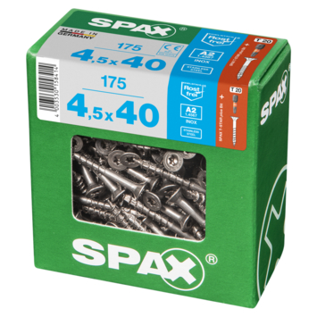 SPAX Roestvaststalen schroef, 4,5 x 40 mm, 175 stuks, Deeldraad, Verzonken kop, T-STAR plus T20, 4CUT, Roestvast staal A2