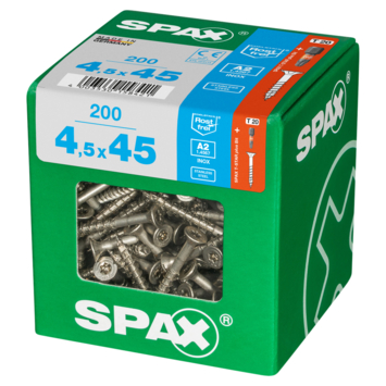 SPAX Roestvaststalen schroef, 4,5 x 45 mm, 200 stuks, Deeldraad, Verzonken kop, T-STAR plus T20, 4CUT, Roestvast staal A2