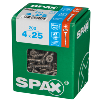SPAX Roestvaststalen schroef, 4 x 25 mm, 200 stuks, Voldraad, Verzonken kop, T-STAR plus T20, 4CUT, Roestvast staal A2