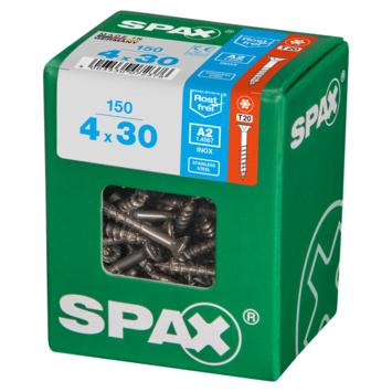 SPAX Roestvaststalen schroef, 4 x 30 mm, 150 stuks, Deeldraad, Verzonken kop, T-STAR plus T20, 4CUT, Roestvast staal A2