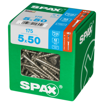 SPAX Roestvaststalen schroef, 5 x 50 mm, 175 stuks, Deeldraad, Verzonken kop, T-STAR plus T20, 4CUT, Roestvast staal A2
