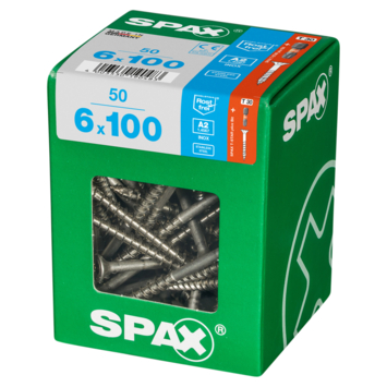 SPAX Roestvaststalen schroef, 6 x 100 mm, 50 stuks, Deeldraad, Verzonken kop, T-STAR plus T30, 4CUT, Roestvast staal A2