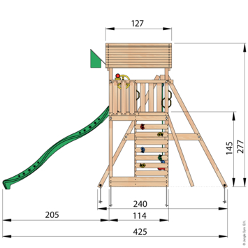 Verschaf je kinderen uren aan plezier in de frisse lucht met dit fantastisch speeltoestel. Het bevat twee schommelzitjes, een lange glijbaan, een zandbak, een klimwand met grote grepen, een trapje, een telescoop en een stuur. Het toestel is bestemd voor kinderen tussen 3 en 10 jaar en draagt bij aan hun fantasie en spirit voor avontuur. Jungle Gym heeft al een spanne van 30 jaar aan gepassioneerde ervaring op het vlak van speeltoestelontwerp en -fabricage in Nederland, zeker van bijzondere kwaliteit en veiligheid. Onze producten voldoen aan de uiterst strenge Europese veiligheidsvoorschriften (EN 71) en de stoffen zijn weerbestendig en absoluut veilig voor kinderen, vrij van toxische stoffen en allergenen. Kies moeiteloos voor indrukwekkende speelplezierervaringen voor uw kinderen en bied hen het beste speelgenot in hun eigen tuin!