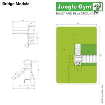 Een avontuurlijk speeltoestel met 2 platformhoogtes, koepelvormig tentdak, klimmuur met gekleurde klimstenen, periscoop kijker, glijbaan met optionele wateraansluiting, grote zandbak én een sterke houten loopbrug die leidt naar een tweede klimtorentje met uitdagingen aan beide kanten; een extra klimmuur met gekleurde klimstenen en een spannende ramp met klimtouw.